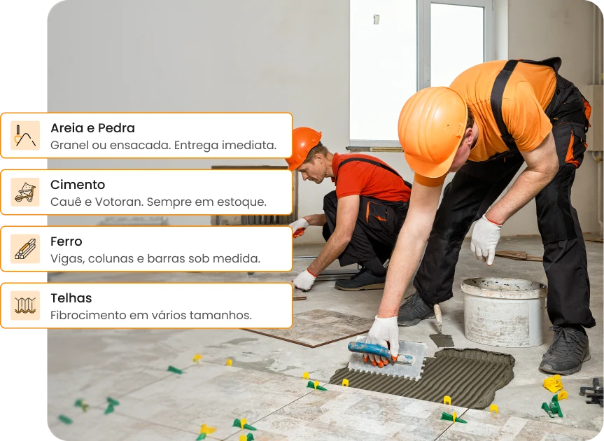 Areia, cimento, pedra, ferro, telhas e tudo para sua obra. Orçamento rápido pelo WhatsApp, sem burocracia.